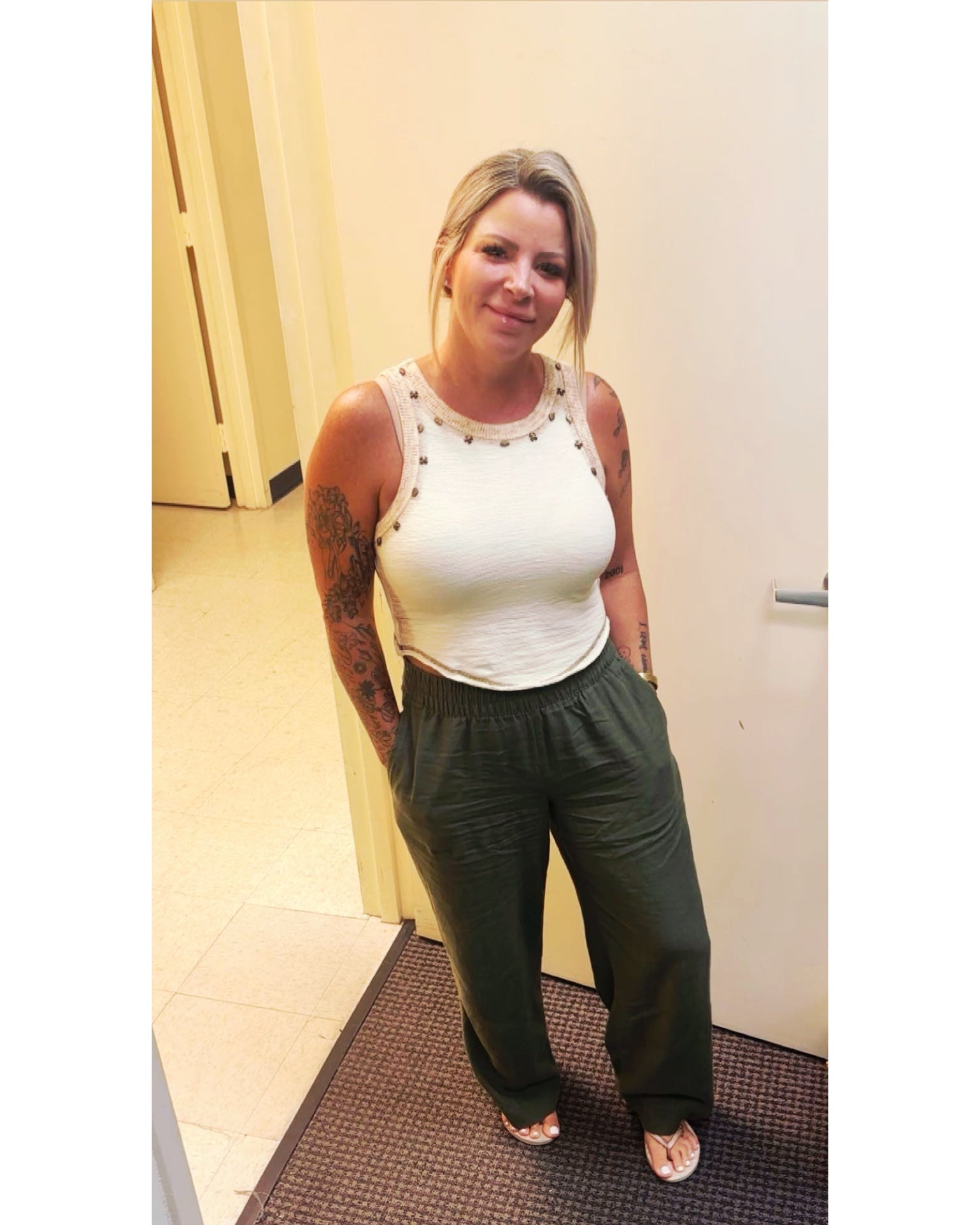 This fitted sleeveless knit top features a round neckline and a distinctive studded solid pattern. Crafted with attention to detail, it offers a bust measurement of 14-1/2", a front length of 18", a back length of 15-3/4", and a shoulder width of 10".